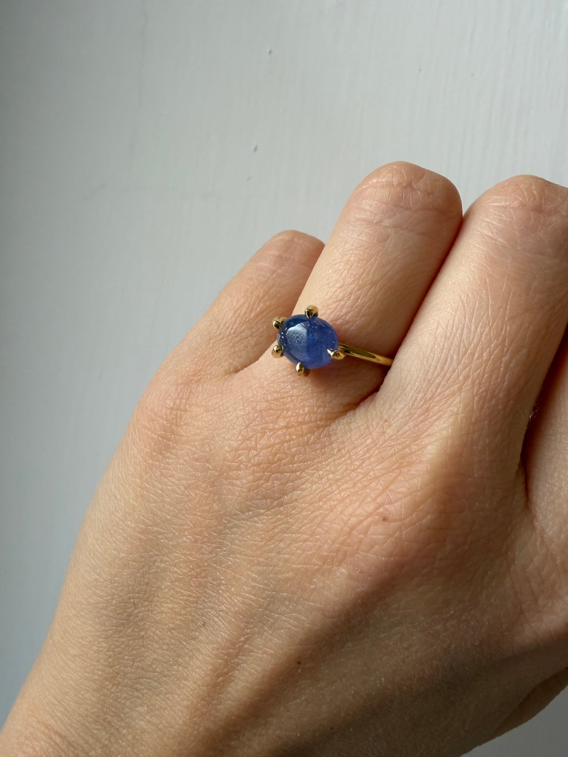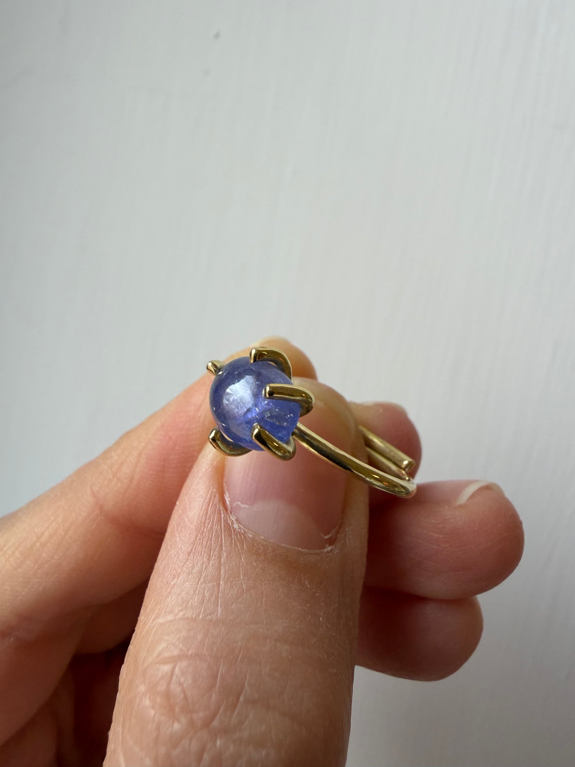 Anello realizzato in ottone, con griffe. La pietra è un ovale di Tanzanite.